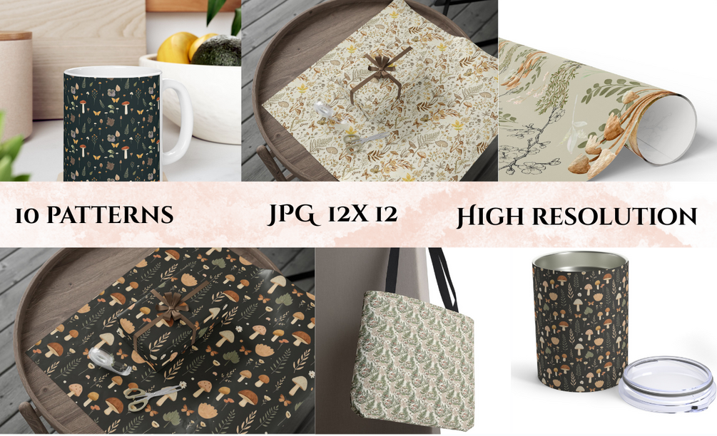 Capture the timeless beauty of nature with this collection of high-resolution, seamless patterns. Featuring delicate hand-drawn mushrooms, fluttering butterflies, and intricate ferns, this pack is designed for creators who love the vintage, earthy, cottagecore aesthetic.
